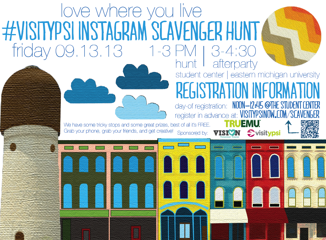 Eastern Michigan University’s VISION office contacted me not too long after the hunt in May to see if Visit Ypsi would help them put together a scavenger hunt for incoming freshman. The second hunt took place Friday, September 13. Using basically the same format, this hunt was modified slightly to familiarize students with the Ypsilanti area and build our brand (@visitypsi #visitypsi).